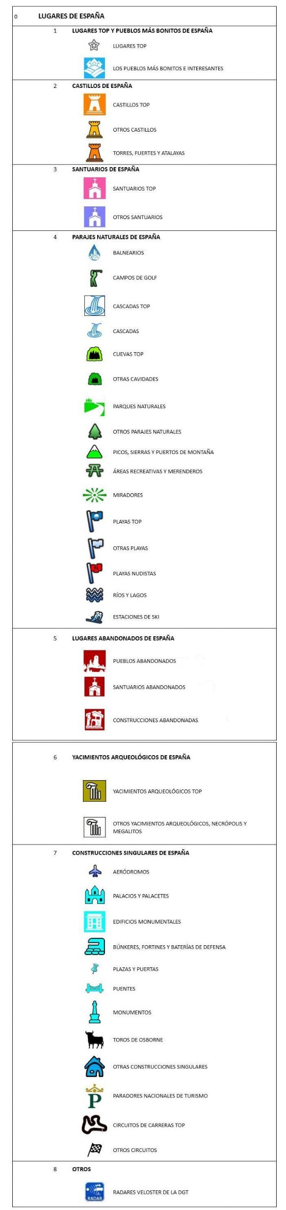 Esta es la estructura de LUGARES DE ESPAÑA PRO y los iconos que representan cada una de las categorías de los sitios*: