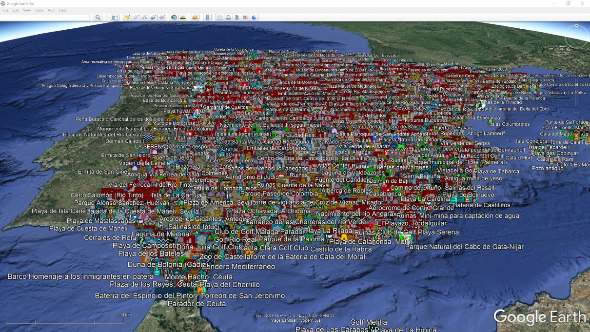 Si cargamos el archivo kml LUGARES DE ESPAÑA PRO en un visor de mapas como Google Earth, veamos que ocurre:
