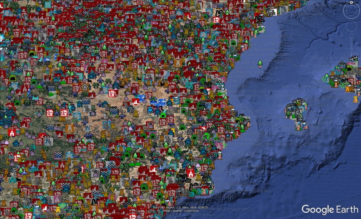 *Nota: Las vistas desde gran altitud de Google Earth sólo muestran algunas de las chinchetas, no todas. Los Packs se pueden visualizar u ocultar a voluntad (en los visores que lo admiten).